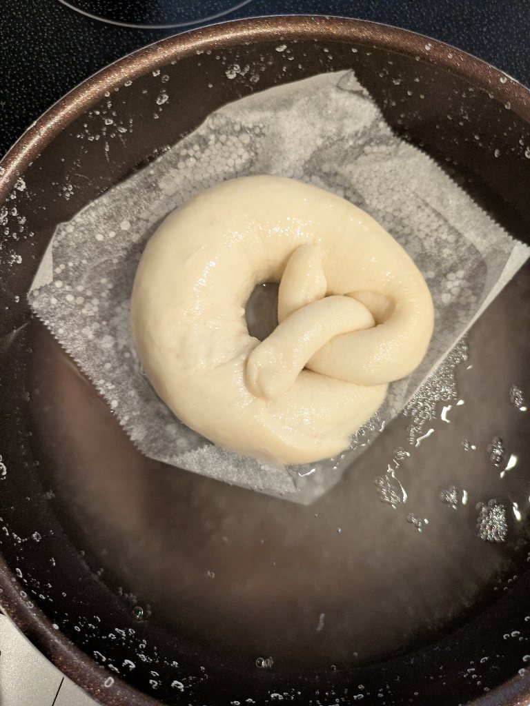 一次発酵の後でゴムのように縮む生地をなんとか細長く伸ばしてあの腕組みポーズの形にしたら1リットルのお湯に50グラムの重曹を溶かして生地をくぐらせました。