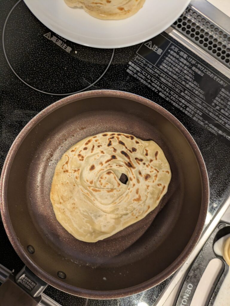 そうして蛇腹に重ねてバラのように丸めた生地を平らに潰してフライパンで焼きます。